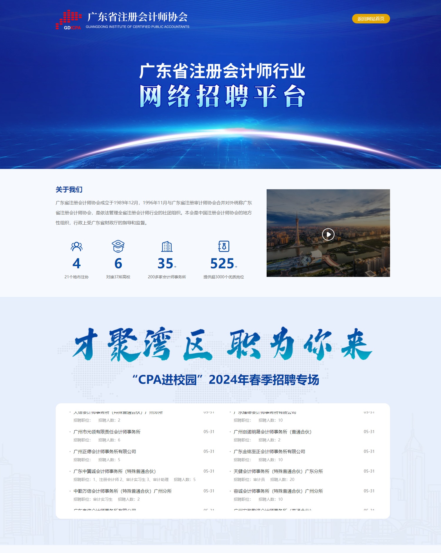 廣東省注冊會計師行業(yè)網(wǎng)絡(luò)招聘平臺是聯(lián)合全省21個地市注協(xié)搭建的“一站式”垂直招聘平臺,專注于注冊會計師行業(yè)的招聘,服務(wù)全省近1100家會計師事務(wù)所,為全國大學(xué)畢業(yè)生提供注冊會計師行業(yè)的招聘信息,實現(xiàn)精準(zhǔn)匹配。